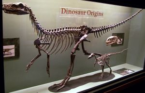 انشقت الديناصورات عن أسلافها من الأركوصورات منذ حوالي 230 مليون سنة، أي منذ أواسط حتى أواخر العصر الثلاثي، وبهذا فإنها تكون قد ظهرت بعد 20 مليون سنة من حادثة انقراض العصر البرمي-الثلاثي، التي قضت على ما يقرب من 95% من أشكال الحياة على الأرض،[27][28] وقد دعمت الدراسات الإشعاعية لتحديد عمر طبقات الصخور التي حوت المستحثات الخاصة بجنس الديناصور الفجري أيورابتور، وهو أحد أكثر أجناس الديناصورات بدائيةً، دعمت هذه النظرية سالفة الذكر.[29] يقول علماء الأحياء القديمة أن الأيورابتور يشابه السلف المشترك لكل الديناصورات؛ وإن ثبتت صحة هذه النظرية فإن هذا يفيد بأن الديناصورات البدائية كانت مفترسات صغيرة الحجم ذات قائمتين.[30] أظهرت بعض الاكتشافات لديناصورات طيرية العنق في طبقات العصر الثلاثي بالأرجنتين أن هذه الحيوانات كانت بالفعل مفترسات صغيرة ذات قائمتين، الأمر الذي يدعم النظرية سالفة الذكر.