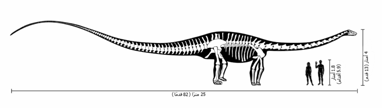 While dinosaurs were ancestrally bipedal, many extinct groups included quadrupedal species, and some were able to shift between these stances. Elaborate display structures such as horns or crests are common to all dinosaur groups, and some extinct groups developed skeletal modifications such as bony armor and spines. While the dinosaurs' modern-day surviving avian lineage (birds) are generally small due to the constraints of flight, many prehistoric dinosaurs (non-avian and avian) were large-bodied—the largest sauropod dinosaurs are estimated to have reached lengths of 39.7 متر (130 أقدام) and heights of 18 m (59 ft) and were the largest land animals of all time. The misconception that non-avian dinosaurs were uniformly gigantic is based in part on preservation bias, as large, sturdy bones are more likely to last until they are fossilized. Many dinosaurs were quite small, some measuring about 50 سنتيمتر (20 بوصات) in length.