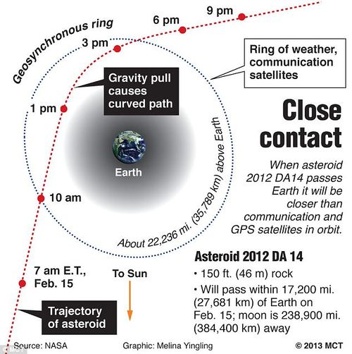 "" هناك عدد قليل المدار الاقمار 100 كيلومتر في 22300، أعلى من مسار الكويكب، ولكن العلماء يقولون أنه من فرصة ضرب واحد هو بعيد للغاية. ومع ذلك، قد حذرت مشغلي الأقمار الصناعية