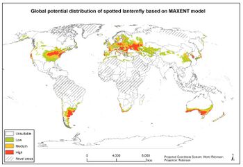 - ^ Jung, Jae-Min; Jung, Sunghoon; Byeon, Dae-hyeon; Lee, Wang-Hee (December 2017). "Model-based prediction of potential distribution of the invasive insect pest, spotted lanternfly Lycorma delicatula (Hemiptera: Fulgoridae), by using CLIMEX". Journal of Asia-Pacific Biodiversity. 10 (4): 532–538. doi:10.1016/j.japb.2017.07.001. ISSN 2287-884X.