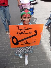 فتاة فلسطينية تحتج في ذكرى النكبة 2919 في الخليل، الضفة الغربية. تحمل الفتاة لافتة مكتوب عليها "حتماً ستعود فلسطين". معظم اللاجئين الفلسطينيين في الضفة الغربية ينحدرون من عائلات طردت من أراضيها التي احتلتها إسرائيل عام 1948.[2]