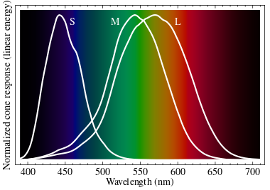 Since each wavelength w stimulates each of the 3 types of cone cells to a known extent, these extents may be represented by 3 functions s(w), m(w), l(w) corresponding to the response of the S, M, and L cone cells, respectively.