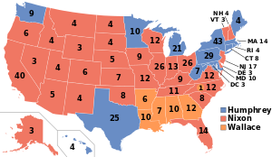 In addition to Nixon and Humphrey, the race was joined by former Democratic Governor George Wallace of Alabama, a vocal segregationist who ran on the American Independent Party ticket. Wallace held little hope of winning the election outright, but he hoped to deny either major party candidate a majority of the electoral vote, thus sending the election to the House of Representatives, where segregationist congressmen could extract concessions for their support.[18] The assassinations of Kennedy and Martin Luther King Jr., combined with disaffection towards the Vietnam War, the disturbances at the Democratic National Convention, and a series of city riots in various cities, made 1968 the most tumultuous year of the decade.[19] Throughout the year, Nixon portrayed himself as a figure of stability during a period of national unrest and upheaval.[20] He appealed to what he later called the "silent majority" of socially conservative Americans who disliked the 1960s counterculture and the anti-war demonstrators.[21] Nixon waged a prominent television advertising campaign, meeting with supporters in front of cameras.[22] He promised "peace with honor" in the Vietnam War but did not release specifics of how he would accomplish this goal, resulting in media intimations that he must have a "secret plan".[23]