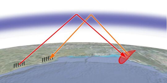The most common type of OTH radar uses skywave or "skip" propagation, in which shortwave radio waves are refracted off an ionized layer in the atmosphere, the ionosphere, and return to Earth some distance away. A small amount of this signal will be scattered off desired targets back towards the sky, refracted off the ionosphere again, and return to the receiving antenna by the same path. Only one range of frequencies regularly exhibits this behaviour: the high frequency (HF) or shortwave part of the spectrum from 3–30 MHz. The best frequency to use depends on the conditions of the atmosphere and the sunspot cycle. For these reasons, systems using skywaves typically employ real-time monitoring of the reception of backscattered signals to continuously adjust the frequency of the transmitted signal.[1]