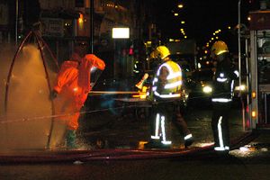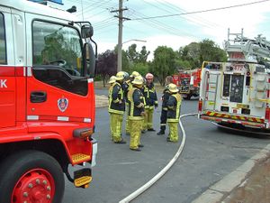 ![]() Pair of firefighters extingushing a blaze using a water hose | |