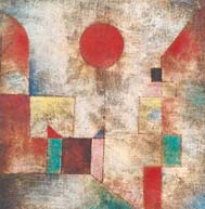 المنطاد الأحمر للفنان بول كلي 1922م. رُسمت بالزيت على نسيج قطني طُلي بطبقة جيرية ورُكِّبت على لوح خشبي بمقياس 31x32سم.