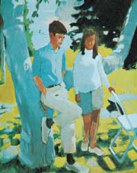 الدهان الأكريلي يتيح للفنانين إنتاج تأثيرات لونية متعددة. واللوحة التي رسمها فيرفيلد پورتر (أعلاه) تركز على الألوان الباهتة.