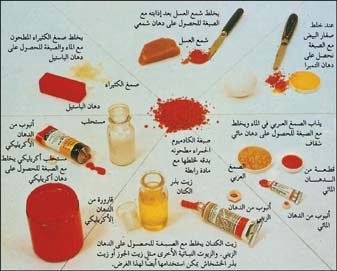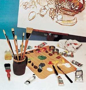 أدوات الفنان تشمل الألوان والمُخفِّفات، والفُرش والمُدَى. وتوضّح هذه الصورة كيف يرتب الفنان هذه الأدوات عندما يقوم برسم لوحة زيتية.