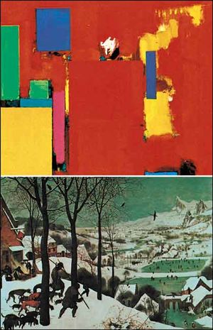 لوحات كبار الفنانين قد لايكون لها موضوع محدد مثل لوحة الحائط الذهبي (1961م) (أعلى) لهوفمان التي تتكون فقط من ألوان زاهية. وقد تتناول اللوحات مواضيع الحياة العامة مثل لوحة عودة الصيادين (1565م) بييتر بروجيل الأكبر (أسفل).