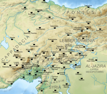 In late October 906, he accompanied the general Ahmad ibn Kayghalagh in an invasion of Byzantine territory. The Abbasid army captured the town of Salandu (Selinus) and advanced even up to the Halys River, where they met and defeated a Byzantine force, capturing 5,000 prisoners according to al-Tabari.[1][3] At about this time (ca. 905/907), he concluded a written treaty with the Byzantine envoy Leo Choirosphaktes, according to which the two sides would continue fighting for two more years but conclude a truce and carry out a prisoner exchange on the third.[1] When the Byzantine general Andronikos Doukas, falling victim to the machinations of the eunuch Samonas and facing charges of insubordination against emperor Leo VI the Wise, sought refuge in the fortress of Kabala, the emperor sent the general Gregoras Iberitzes to convince Andronikos and his relatives and followers to surrender, but the latter sought the aid of the Arabs of Tarsus. Rustam left Tarsus in February/March 907 with his troops. He reached Kabala, bringing back both Andronikos and his son Constantine Doukas to Arab territory, and torched Iconium on his way.[1][4][5]
