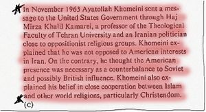 "في نوفمبر 1963 أرسل آية الله الخميني رسالة إلى حكومة الولايات المتحدة من خلال [الأستاذ بجامعة طهران ] الحاج ميرزا خليل كمرهإي"، حيث أوضح "أنه لم يكن معارضاً للمصالح الأمريكية في إيران" وأنه "على العكس من ذلك، فقد اعتقد أن الوجود الأمريكي كان ضرورياً لموازنة النفوذ السوڤيتي وربما البريطاني." | ![]() |