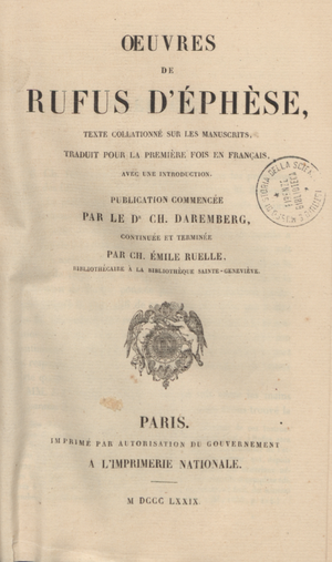 Although Rufus was a voluminous author, the majority of his works no longer survive in full. The most recent attempt to publish his corpus as a whole remains C. Daremberg and E. Ruelle's Oeuvres de Rufus d'Éphèse: texte collationé sur les manuscrits, traduits pour la première fois en français, avec une introduction (1879). Important studies of Rufus' corpus were subsequently published in the 20th century by Johannes Ilberg[5] and Alexander Sideras.[6]