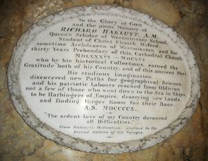 has generic name (help) 2 vols. - A Reproduction of the Tablet Erected in Bristol Cathedral to the Memory of Richard Hakluyt Born 1522, Died 1616 (OB3). London: Hakluyt Society. 1911.