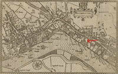 الموقع على نهر التيمس ل مستشفى ساڤوي للفقراء والمحتاجين التي أسسها هنري السابع، حيث كان هاكلويت قساً، يشير غليها سهم أحمر في هذه الصورة لخريطة جون نوردن لوستمنستر التي نـُشرت في 1593.