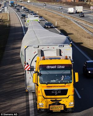 مركبة خاصة، تسير بسرعة 60 كيلومترا في الساعة، وتنقل الجزء العملاق إلى مسافة 575 كيلومترا من مصنع الشفرات في ألبورغ ، الدنمارك ، إلى بلدة Nakskov الدنماركية في جزيرة ولاند. الدوار الذى يبلغ قطره 154 مترا ويبلغ حجم تغطيته 18600 مترا مربعا , أى مايوازى مرتين ونصف مساحة ملعب كرة قدم. تقول سيمنس أن إنتاج الطاقة لواحد من تلك التوربينات ذات 6 ميجاوات يكفي لتزويد نحو 6000 من المنازل الأوربية بالطاقة الكهربية اللازمة.