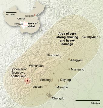 The earthquake occurred 92 km northwest of the city of Chengdu in eastern Sichuan province and over 1500 km from Beijing, where it was also strongly felt. Earthquakes of this size have the potential to cause extensive damage and loss of life.