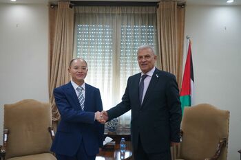 زنگ جيشين، رئيس مكتب جمهورية الصين الشعبية في دولة فلسطين، يلتقي مع السيد زياد أبو عمرو، نائب رئيس وزراء الفلسطيني، في رام الله في 29 أغسطس 2023، لمناقشة نتائج قمة البريكس التي انعقدت في جوهانسبرگ.