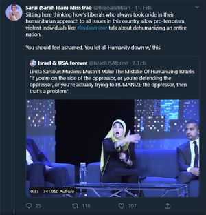 في شهر كانون الثاني 2020 حضرت كمتحدثة الى فعالية اقامها الصندوق القومي اليهودي (Jewish National Fund) في ولاية فلوريدا. وفي الشهر نفسه دُعيت ايضا لحضور فعالية أقامتها منظمة (StandWithUs) المهتمة بمكافحة معاداة السامية والداعمة لاسرائيل.