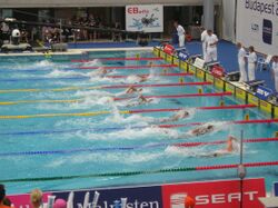 السباحة الحرة Freestyle هي تصنيف في swimming competition, defined by the rules of the International Swimming Federation (FINA), in which competitors are subject to a few limited restrictions[1] on their swimming stroke. Freestyle races are the most common of all swimming competitions, with distances beginning with 50 meters (50 yards) and reaching 1500 meters (1650 yards),[2] also known as the mile. The term 'freestyle stroke' is sometimes used as a synonym for 'front crawl',[3] as front crawl is the fastest swimming stroke. It is now the most common stroke used in freestyle competitions.[بحاجة لمصدر]
