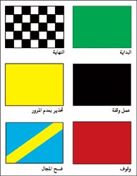 أعلام خاصة بسباق السيارات تشير إلى بداية السباق ونهايته. توجد أعلام أخرى ترشد السائق لكي يقف وقفة قصيرة للتزود بالوقود أو تبديل الإطارات أو تمنعه المرور لوجود حادث على الطريق أو تطلب منه الوقوف أو فسح المجال لمرور السيارة الأسرع.