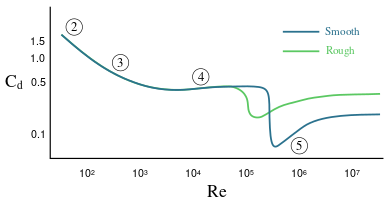 Drag coefficient Cd for a sphere as a function of Reynolds number Re, as obtained from laboratory experiments. The dark line is for a sphere with a smooth surface, while the lighter line is for the case of a rough surface.