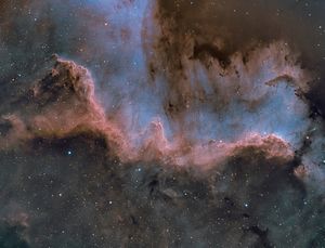 سديم أمريكا الشمالية (North America Nebula ؛ NGC 7000 أو Caldwell 20) هو emission nebula in the constellation Cygnus, close to Deneb (the tail of the swan and its brightest star). The remarkable shape of the nebula resembles that of the continent of North America, complete with a prominent Gulf of Mexico. It is sometimes incorrectly[بحاجة لمصدر] called the "North American Nebula".[3]