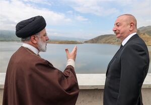 الرئيس الإيراني إبراهيم رئيسي يلتقي الرئيس الأذربيجاني إلهام علييڤ على الحدود، قبيل افتتاحهما سداً على نهر آراس، 18 مايو 2024. |