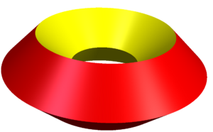 A surface of revolution with a hole in, where the axis of revolution does not intersect the surface, is called a toroid.[9] For example, when a rectangle is rotated around an axis parallel to one of its edges, then a hollow square-section ring is produced. If the revolved figure is a circle, then the object is called a torus.