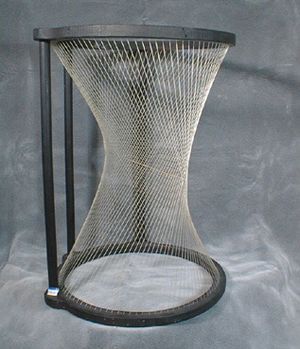 An elliptic hyperboloid of one sheet. The wires are straight lines. For any point on the surface, there are two straight lines lying entirely on the surface which pass through the point. This illustrates the doubly ruled nature of this surface.