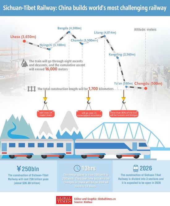 - ^ "Sichuan-Tibet Railway: China builds world's most challenging railway". گلوبال تايمز. 2018-10-19.