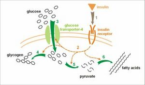 The precise mechanisms underlying gestational diabetes remain unknown. The hallmark of GDM is increased insulin resistance. Pregnancy hormones and other factors are thought to interfere with the action of insulin as it binds to the insulin receptor. The interference probably occurs at the level of the cell signaling pathway beyond the insulin receptor.[27] Since insulin promotes the entry of glucose into most cells, insulin resistance prevents glucose from entering the cells properly. As a result, glucose remains in the bloodstream, where glucose levels rise. More insulin is needed to overcome this resistance; about 1.5–2.5 times more insulin is produced than in a normal pregnancy.[27]