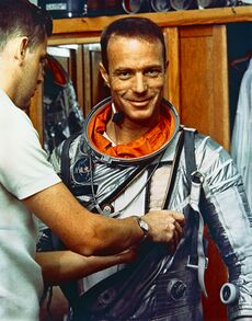 After the most trouble-free countdown of Project Mercury to date, Carpenter flew into space on May 24, 1962, watched by 40 million television viewers.[47] He performed five onboard experiments per the flight plan, and became the first American astronaut to eat solid food in space. He also identified the mysterious "fireflies" observed by Glenn during Friendship 7 as particles of frozen liquid loosened from the outside of the spacecraft, which he could produce by rapping on the wall near the window. He renamed them "frostflies".[48]