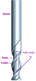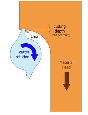 Looking at the formula for the spindle speed, S, it can be seen that larger tools require lower spindle speeds, while small tools may be able to go at high speeds. | The formula for the feed rate, F shows that increasing S or z gives a higher feed rate. Therefore, machinists may choose a tool with the highest number of teeth that can still cope with the swarf load. |