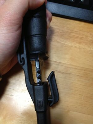 The Glock knife is a military field knife product line designed and produced by Glock Ges.m.b.H., located in Deutsch-Wagram, Austria. It can also be used as a bayonet, by engaging a socket in the pommel (covered by a plastic cap) into a bayonet adapter that can be fitted to the Steyr AUG rifle.[1][2][3]