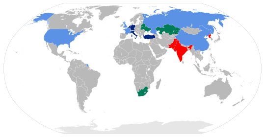 الدول التي كانت تمتلك أسلحة نووية هي جنوب أفريقيا (أسلحة نووية مطورة لكنها فككت ترسانتها قبل الانضمام إلى معاهدة عدم انتشار الأسلحة النووية)[27] والجمهوريات السوڤيتية السابقة؛ بلاروسيا، قزخستان، وأوكرانيا، التي سلمت عن أسلحتها لروسيا.