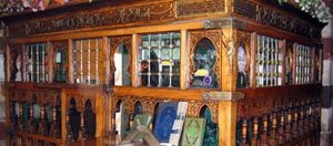 أما نجارة المسجد فقد كانت على جانب عظيم من الأهمية.. ولم يبق منها إلا المنبر الذى لا شك في أنه فخر المنابر الإسلامية في دولة المماليك الجراكسة. فقد طعمت حشواته بالسن والزرنشان. وامتازت جوانبه وأبوابه بتقاسيم فريدة وخاصة في دائرته الكبرى. ومما زاد في اهميته اشتماله على اسم صانعه المكتوب على باب المقدم بما نصه «نجارة العبد الفقير إلى الله تعالى الراجى عفوربه الكريم «على بن طنين» بمقام سيدى حسين أبو على.. نفعنا الله».