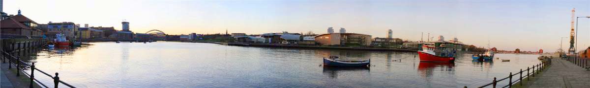![]() By row the minster and Wearmouth Bridge; the city hall, the Winter Gardens Museum and Penshaw Monument as well as a view of the marina | |