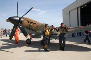 Spitfire XVIe NH749 of the Commemorative Air Force, based at Camarillo airport, Southern California, seen with period-dressed crew members in 2011.