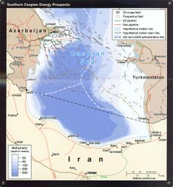 - لم تُرسم حدود بحر قزوين بين أذربيجان وإيران وتركمانستان بعد، على الرغم من أن هذه المشكلة من المقرر حلها سلمياً في السنوات القادمة من خلال المفاوضات البطيئة. بعد تفكك الاتحاد السوڤيتي، طالبت الجمهوريات المستقلة حديثًا المطلة على بحر قزوين حصصاً من المياه الإقليمية وقاع البحر، وبالتالي ألغت من جانب واحد الاتفاقيات القائمة بين الاتحاد السوفييتي وإيران والتي وافقت الجمهوريات، مثل جميع المعاهدات السوڤيتية الأخرى، على احترامها عند استقلالها. وقد اقترحت هذه البلدان تقسيم بحر قزوين بما يتناسب مع خط ساحل كل دولة مجاورة، وفي هذه الحالة سيتم تقليص حصة إيران إلى حوالي 13%. أعرب الجانب الإيراني عن حرصه على معرفة ما إذا كان هذا يعني أن جميع الاتفاقيات الإيرانية الروسية والسوڤيتية باطلة، مما يمنح إيران الحق في المطالبة بالسيادة الإقليمية على الأراضي التي فقدتها لروسيا بموجب المعاهدات التي لا تزال الأطراف تعتبرها "حية". لقد تم تسوية القضايا بين روسيا وقزخستان وأذربيجان في عام 2003، لكن إيران لا تعترف بهذه الاتفاقيات، على أساس أن القانون الدولي الذي يحكم المياه المفتوحة لا يمكن تطبيقه على بحر قزوين، والذي هو في الواقع بحيرة (مسطح مائي غير ساحلي). ولم تضغط إيران على مطالباتها الإقليمية في بحر قزوين في السنوات الأخيرة لأنها تعتمد بشكل كبير على دعم روسيا في معركتها النووية مع الغرب.
