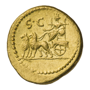 Cumaean Sibyl on a coin of 43 BC, shown riding in a biga drawn by lions with a patera in her hand.