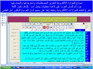 صورة لشاشة كمبيوتر تمثل الجزازة الالكترونية لتخزين واسترجاع والبحث في المصطلحات وصناعة المعاجم الالكترونية - نظام اخترعه الدكتور أمل العلمي وقدمه في المؤتمر الثالث لشبكة أحسن.