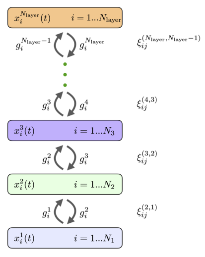 The neurons can be organized in layers so that every neuron in a given layer has the same activation function and the same dynamic time scale. If we assume that there are no horizontal connections between the neurons within the layer (lateral connections) and there are no skip-layer connections, the general fully connected network (11), (12) reduces to the architecture shown in Fig.4. It has