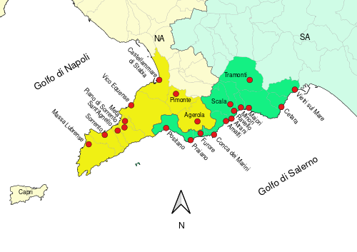 9 comunes of the peninsula are in the territory of the province of Naples and 12 comunes are in the province of Salerno.