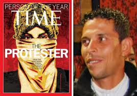 .بدأ الأمر في تونس , حيث الحكم الديكتاتورى مسيطر وطاغ وعبر ترف المعيشة عن خط من المجون, وطفى على السطح قسوة وإضطهاد ضد المواطن العادى —التى أصبحت القشة التي قصمت ظهر البعير -- وهو بائع متجول عمره 26 عاما ويدعى محمد البوعزيزي. عاش بوعزيزى في البلدة الفقيرة سيدى بوزيد على بعد 125 كيلومترا جنوب تونس العاصمة. وفي صباح يوم جمعة بالضبط قبل عام تقريبا,انطلق للعمل،وكان يبيع منتجات محلية من عربة يد, وكانت الشرطة تكدر صفو بوعزيزى على الدوام وبصفة روتينية لسنوات وتقول عائلته،أنه كان يتم تغريمه ، مما جعله يقفز من خلال الأطواق البيروقراطية يجار بالشكوى.وفى يوم 17 ديسمبر 2010 ، بدأ الشرطي يسومه الحزن مرة أخرى. وقام بمصادرة ميزانه وصفعه وادعي أنه يستحق مخالفات. سار مباشرة إلى مبنى عاصمة المقاطعة ليتقدم بشكوى , ولم يتلق أى رد , عند البوابة غمر نفسه بالطلاء , واشعل عود ثقاب . (See pictures of Sidi Bouzid.)