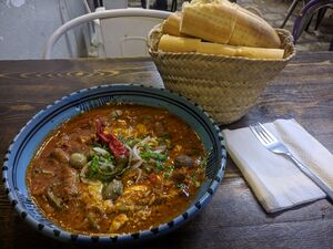 The origin of the dish remains a matter of some controversy with competing claims of Algerian, Libyan, Moroccan, Tunisian, Egyptian, Turkish, and Yemeni origins.[9][10] Tomatoes and peppers are notably New World ingredients that only became common ingredients in later centuries after the Columbian exchange.