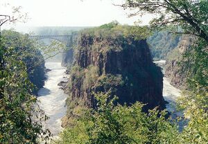 Victoria Falls' Second Gorge (with bridge) and Third Gorge (right). The peninsular cliffs are in Zambia, the outer cliffs in Zimbabwe.