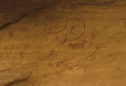 The painted Central Saharan rock art of the Round Head Period was created between 9800 BP and 7500 BP.[16]
