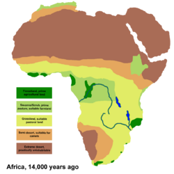Human habitation in North Africa has been greatly influenced by the climate of the Sahara (currently the world's largest warm desert), which has undergone enormous variations between wet and dry over the last few hundred thousand years.[2] This is due to a 41,000-year Axial tilt cycle in which the tilt of the earth changes between 22° and 24.5°.[3] At present (2000 CE), we are in a dry period, but it is expected that the Sahara will become green again in 15,000 years (17,000 CE).