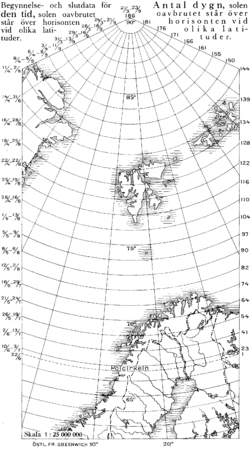 وفي رأس الشمال، النرويج، المعروفة بأنها أقصى النقاط شمالاً في اوروبا القارية فإن تلك الفترة تمتد تقريباً من 14 مايو إلى 29 يوليو. وفي أرخبيل سڤالبارد إلى الشمال، فإن تلك الفترة تزداد لتكون من 20 أبريل إلى 22 أغسطس.[1]