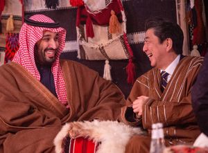 ولي العهد السعودي محمد بن سلمان ورئيس الوزراء الياباني شين‌زو آبه في مخيم شتوي بمحافظة العلا، يناير 2020.